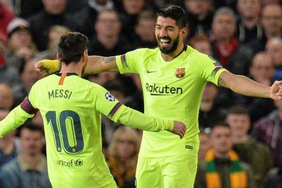 Leonel Messi y Luis Suarez celebran el gol con el que le ganan al Manchester United 1 a 0.
